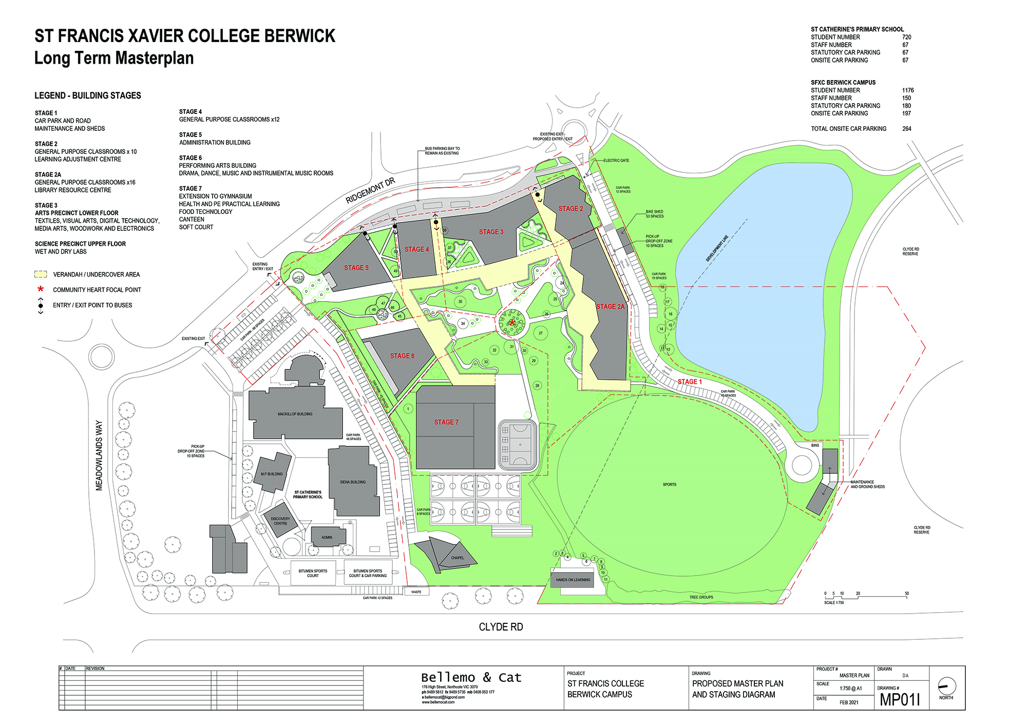 The Berwick Campus of St Francis Xavier encompasses a series of portables classrooms and staff quarters built in the 1980s, there is a current issue with car parking and traffic management on and around the site. This masterplan aims to create a thriving educational campus that will see the school community flourish through the next phase of its development. There will be a pragmatic approach to the reuse and rejuvenation of some of the existing buildings with the creation of new buildings. The plan has a clear strategy to ameliorate traffic congestion in both the school and the local area. The removal of cars from within the centre of the grounds connects the current recreational zones while providing for safe access for students in transition from school to vehicles. The programming of the stages with careful consideration of building compounds will enable the school to continue running its calendar unaffected by construction. Commencing building works from the middle of the school and following through towards the periphery ensures no proposed buildings will hem in future works.